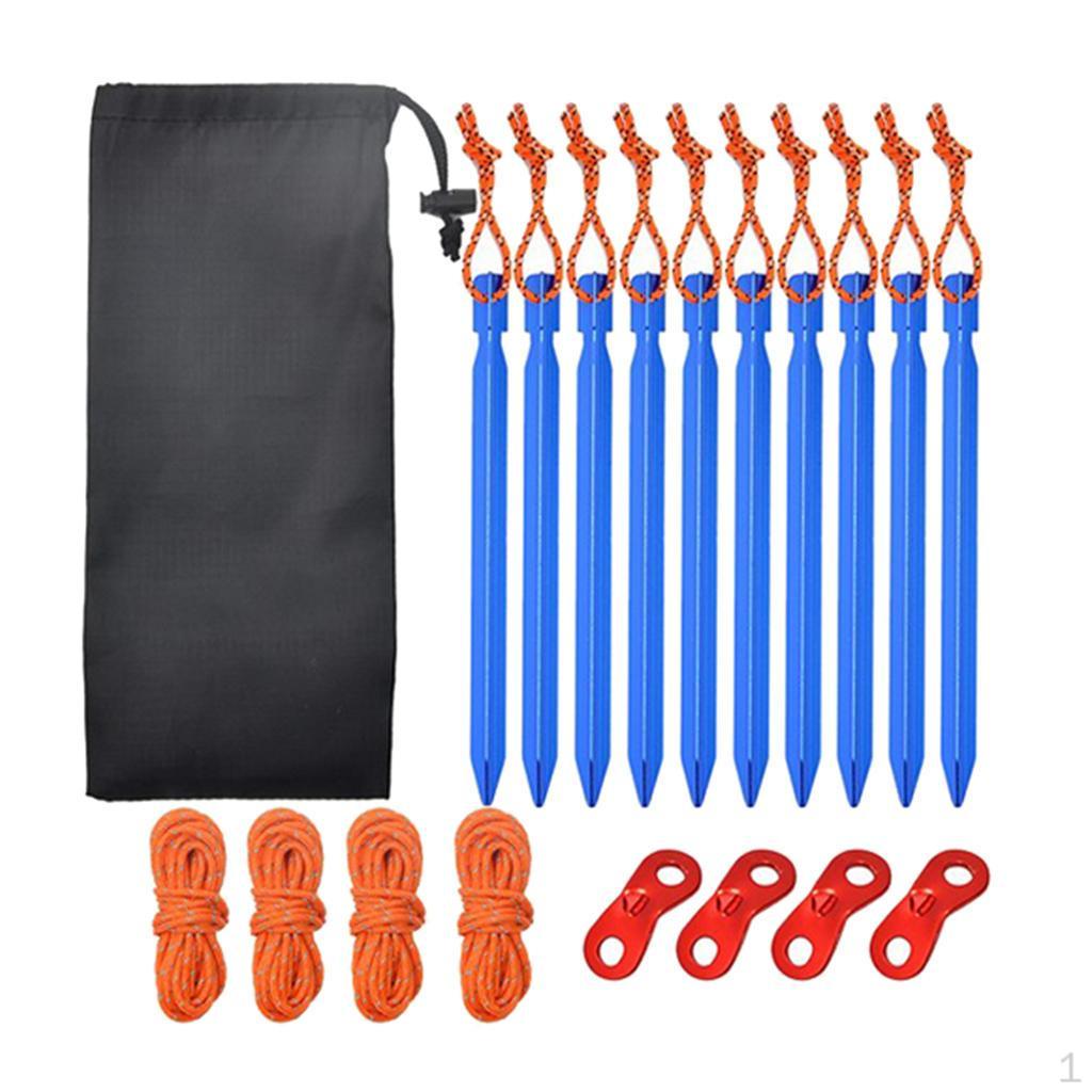 - 【Camping Accessories Kit】Kit includes: 10-Aluminum Tent Stakes, 4-13ft Nylon Rope (Reflect Light), 4-Metal Rope Adjusters. Comes packaged in an individual collection bag.