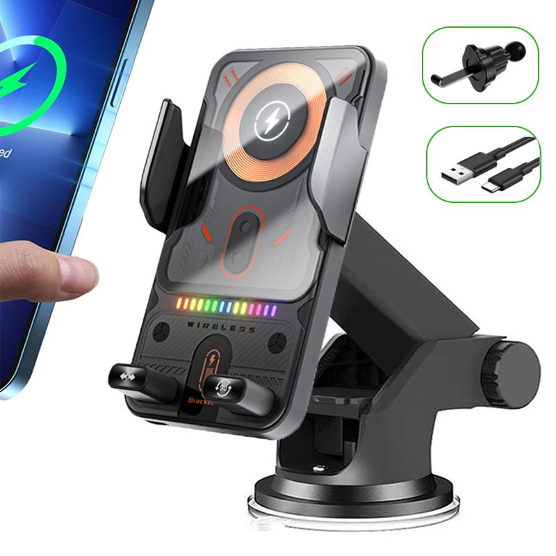 Car Wireless Charger Auto-Clamping RGB Light Phone Holder Stand Touching 360 Rotation Fast Charging Bracket For iPhone Samsung