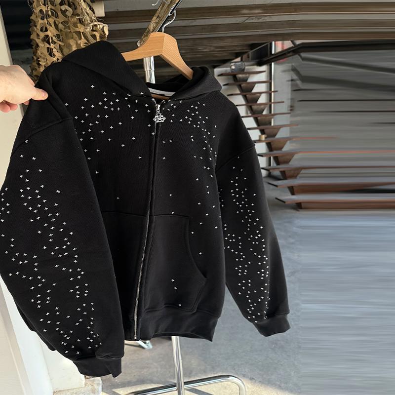 BeatStreet Chic Unisex Starry Sky Rhinestone Hoodie Women Modern Padded Shoulder Zipper Long Sleeve Jacket Street Casual Lady Sweatshirt