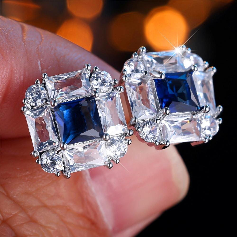 Cute Female Crystal White Blue Zircon Squarel Stone Stud Earrings Silver Color Wedding For Women