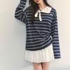 American Vintage Striped Bandage T-shirts Autumn Doll Collar Fashionable Spliced Female Clothing Contrasting Colors Pullovers