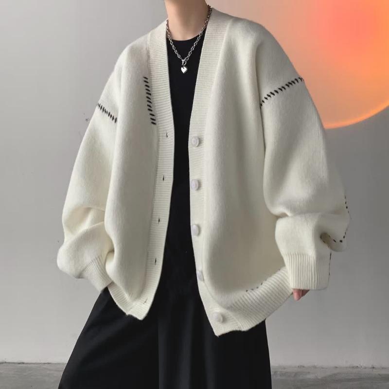 Autumn Winter American V-Neck Jackets Casual Single-breasted Men's Clothing Fashion Bright Line Decoration Loose Vintage Coats