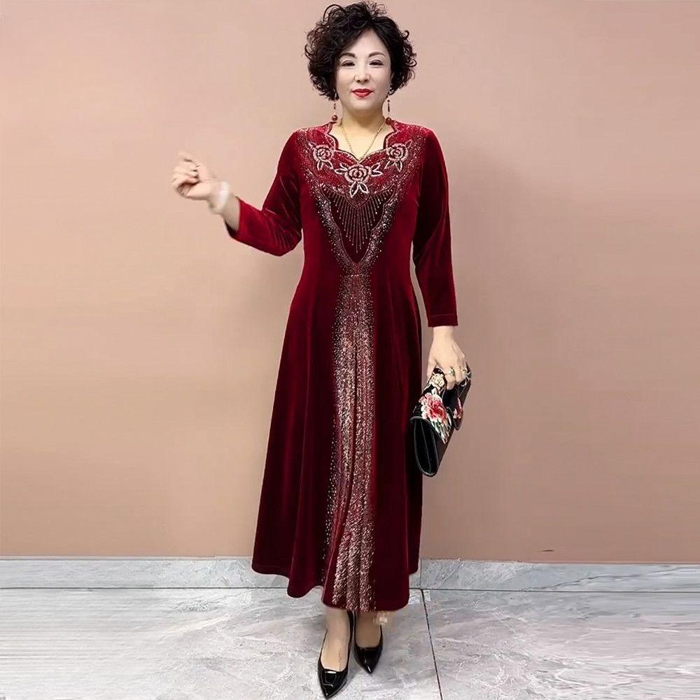 Women's Rhinestone V-Neck Velvet Dress Embroidered Plus Size Dress Long Dress