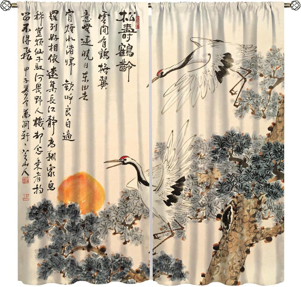 Asian Curtains Vintage Japanese Ink and Landscape Crane Traditional Cherry Blossom Flower Sun Window Treatments Drapes for Girl