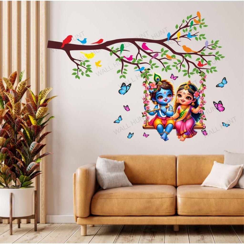 WallHunt PVC Vinyl Tree and Flowers Branch Leaves Radha Krishna Self-Adhesive Wall Sticker for Home Decor/Decoration