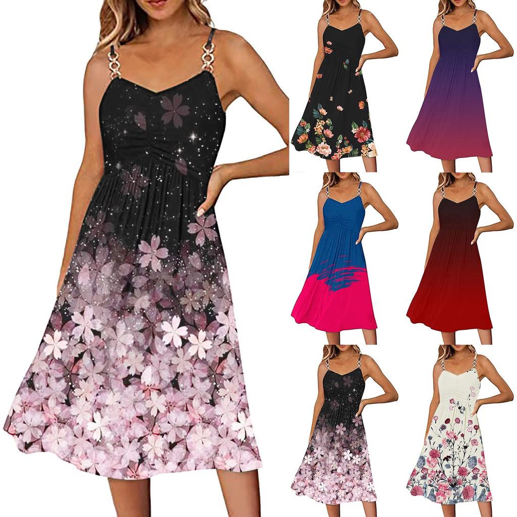 Women's Summer Dress V Neck Spaghetti Strap A-Line Fashion Tank Top Casual Beach Dress