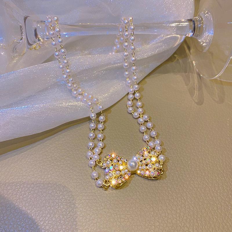 Pearl Neck Chain Trendy Short Bow Necklace Female Summer Light Luxury Fairy Gas Colored Diamond Collarbone Chain