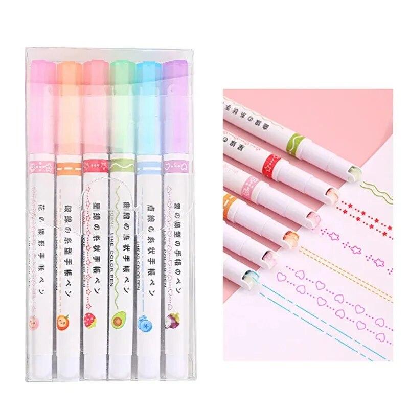 6pcs/set Line Shaped Highlighter Pen Color Roller Tip Curve Liner Art Contour Marker Highlighter Journal School Stationery