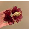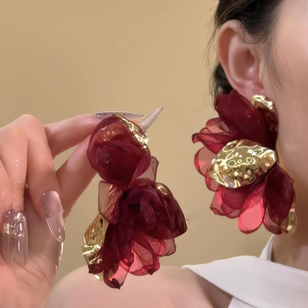 Retro Red Fabric Chiffon Flower Earrings Earrings Exaggerated Earrings Design Sense Niche