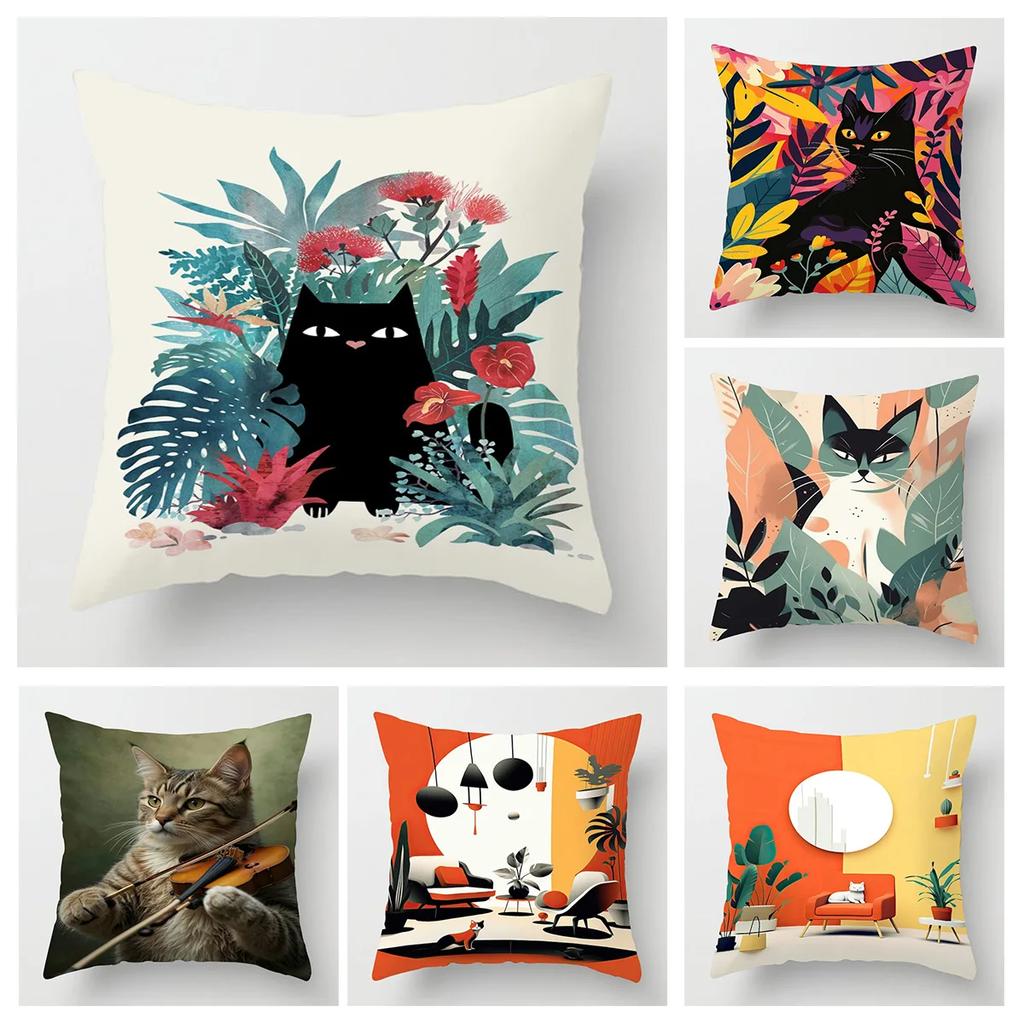 Home Decor Cat & Tropical Plant Patterned Pillow Covers Pattern Cushion Cover Suitable for Sofa Bedroom Car Pillow Cover