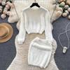Autumn Women Sweet Mohair Knit Sweater Suit O Neck Long Sleeve Pullover Tops+High Waist Bodycon Pencil Skirt Lady Solid Two Piece Set