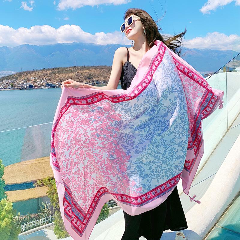 Summer Elegant Women Silk Scarf Beach Wrap Shawls Sweet Pink Floral Print Lady Sunscreen Bandana Hijab Mujer Boho Scarve Pareo
