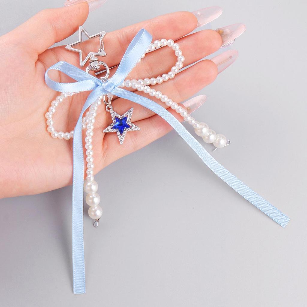 Versatile Multi-Color Webbing Faux Pearl Bow Rhinestone Star Keychain Charm