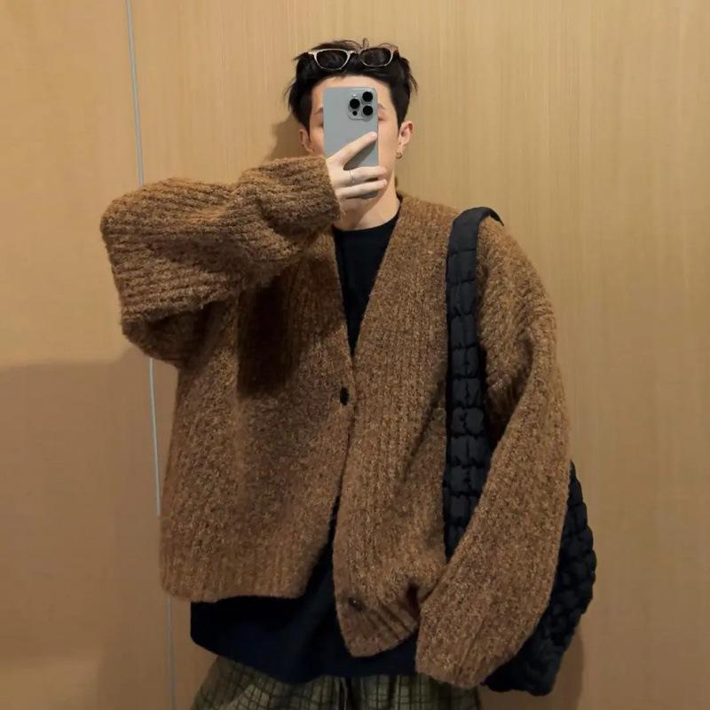 Embrace timeless style with this versatile men's cardigan sweater. Featuring a loose fit, this sweater is perfect for those who appreciate comfort and relaxation in their attire. The V-neckline adds a touch of classic elegance, while the long sleeves provide warmth during autumn and winter seasons. Made from standard-thickness knitted material, it offers a cozy feel without being overly bulky. The intricate knitting detail enhances its retro appeal, making it an ideal choice for stylish layering in cooler months. Whether you're heading out for a casual outing or relaxing indoors, this cardigan is a perfect addition to your seasonal wardrobe.