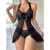 European and American Style Women’s Sheer Mesh Lingerie, Sexy Ultra-Thin Lace Halter Nightgown with Bow Erotic Sleepwear