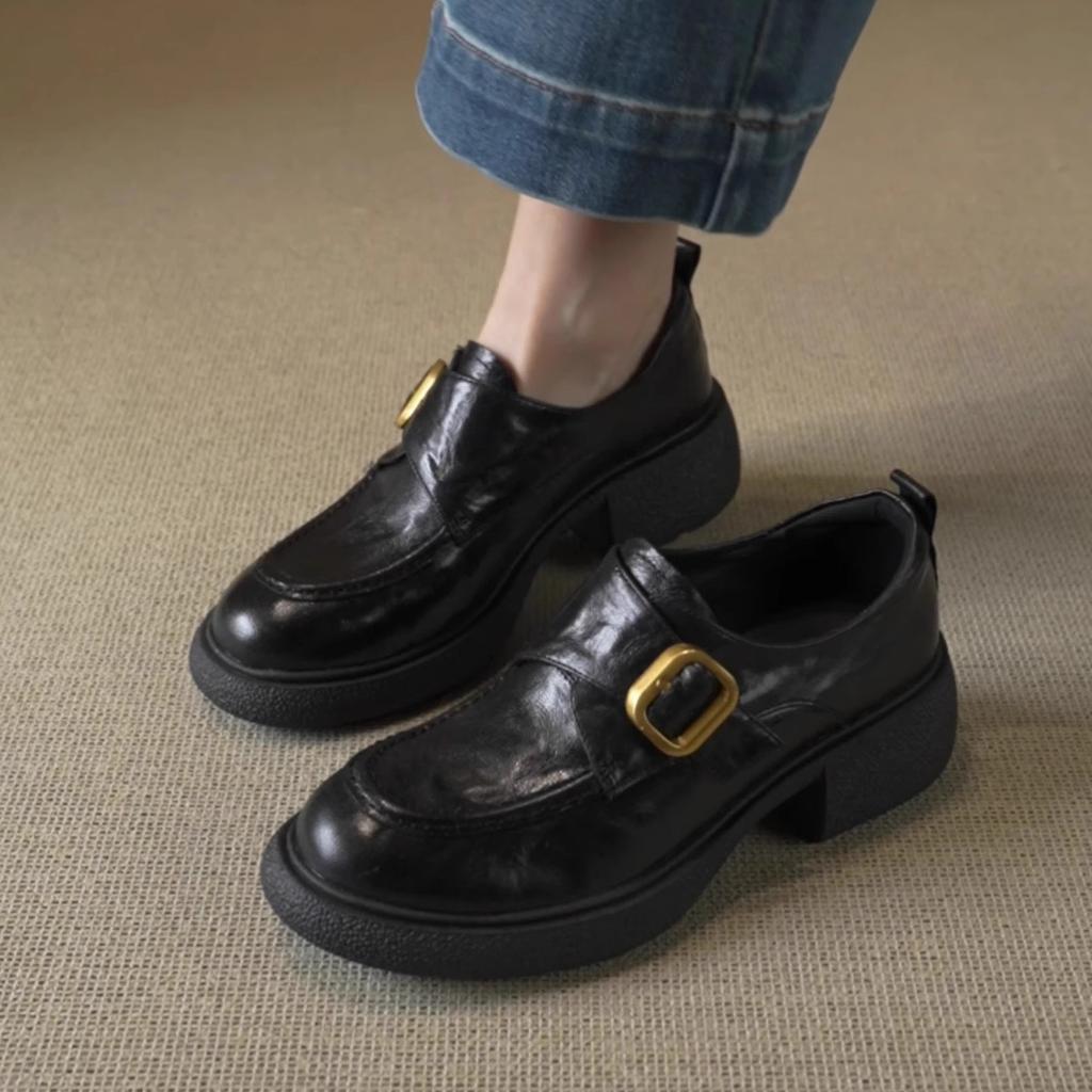 Retro British Style Belt Buckle Loafers Platform Sole One Pedal Thick Heel Single Shoes Small Leather Shoes