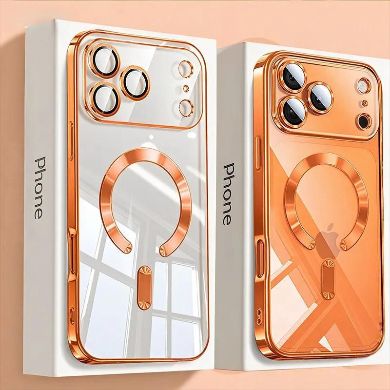 Luxury Plating Magnetic Clear Phone Case For iPhone 17 16 15 14 13 Pro Max 17 Air For Magsafe Lens Protection Shockproof Cover