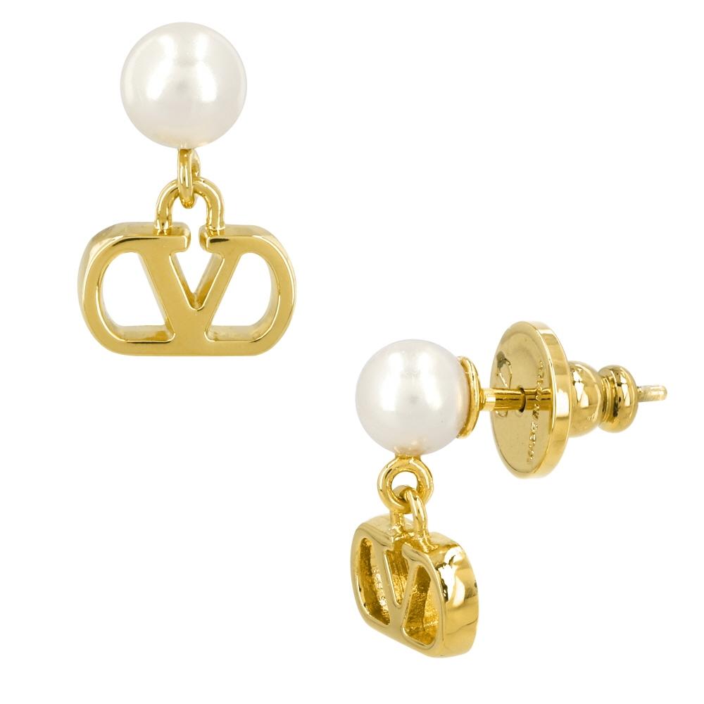 The Valentino Garavani Vlogo Pearl Earrings (J0X81 DHC R5G) feature an elegant design, with a beautiful combination of the brand's V logo and pearl accents on the metal part. These earrings are adorned with a luxurious Garavani pattern, emphasizing the delicate beauty of women. The color is a gold tone, making it a versatile accessory that pairs well with various styles.