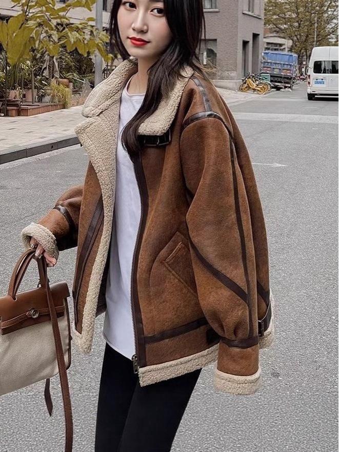 Introducing this stylish motorcycle jacket, designed specifically for women and perfect for the Winter 2025 season. Combining luxe suede with plush lambswool, this jacket offers both warmth and style. The stand neckline adds a contemporary touch while enhancing the jacket's ability to keep out the cold. Though tailored to provide a comfortable and flattering fit for women, its classic motorcycle design brings a touch of edgy sophistication to any outfit. Ideal for fashion-forward individuals seeking both comfort and elegance during the colder months.