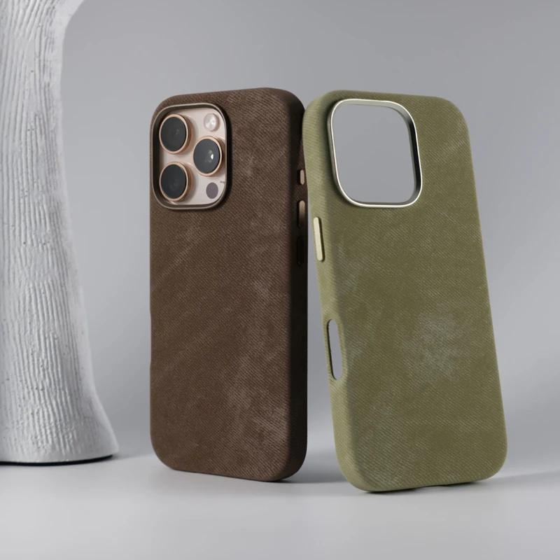 Magnetic Wireless Charging Phone Case for iPhone 16 16pro Max 14 15 Pro 13 12 Retro Flannel Fibre MagSafe Metal Lens Armor Cover