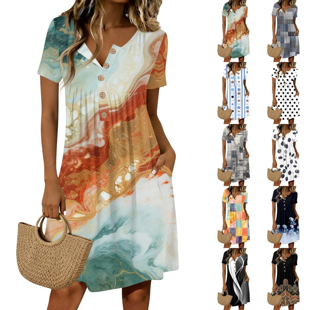 Women's Fashion Retro Print Round Neck Short Sleeve Buttoned Casual Dress