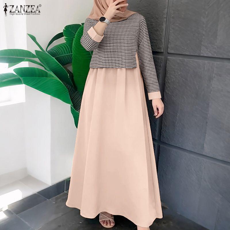 ZANZEA Women Casual Round Neck Loose Long Sleeve Print Dress Muslim