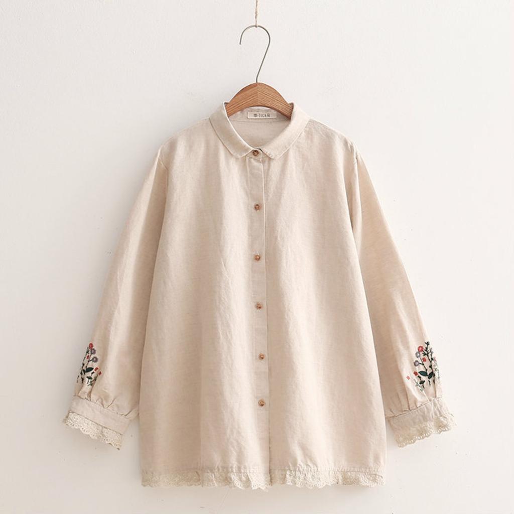 Lace Cotton And Linen Cuffs Embroidered Loose Lapel Long,sleeved Shirt