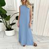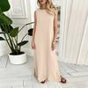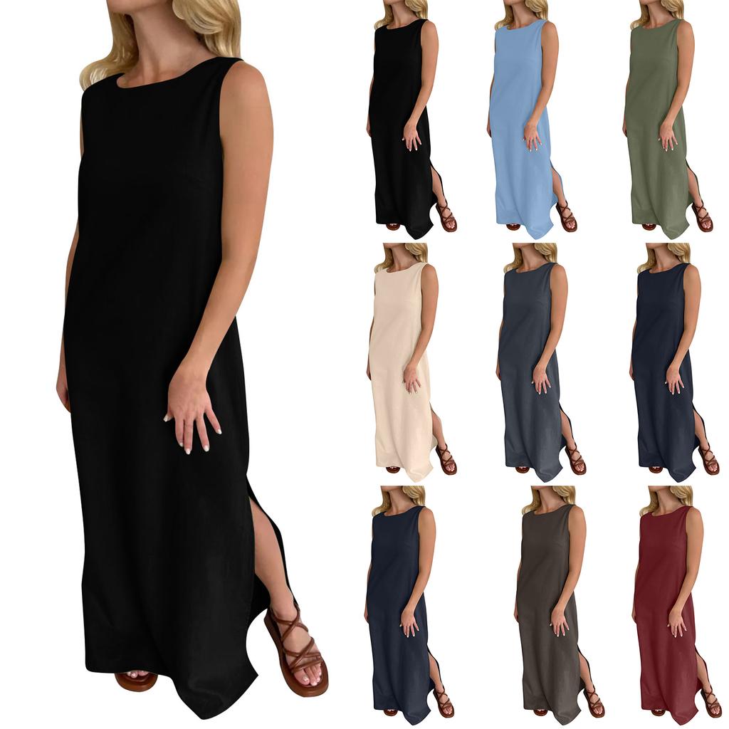 Women's Fashion Round Neck Sleeveless Colour Casual Resort Maxi Dress With Split Hem In Cotton,Linen Blend