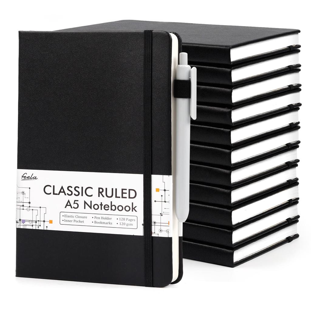 12-Pack Notebook Journals with 12 Black Pens, Feela Hardcover Journals, Bulk College Ruled Black Journals with Pen Holders for Office, School, and Business Use, 120GSM, 5.1" x 8.3"