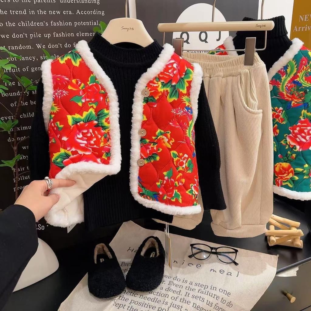 Children's Chinese-Style Fleece-Lined Cotton Vest for Autumn/Winter - Floral Design, Warm New Year Outfit