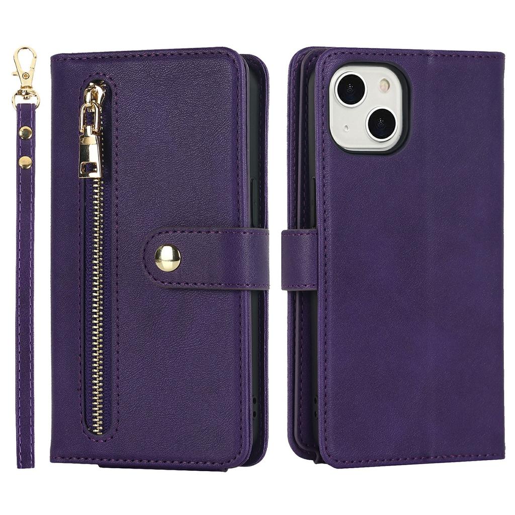 For iPhone 14 Plus Stand Case PU Leather Phone Cover with Straps/Zipper Wallet/Multiple Card Slots