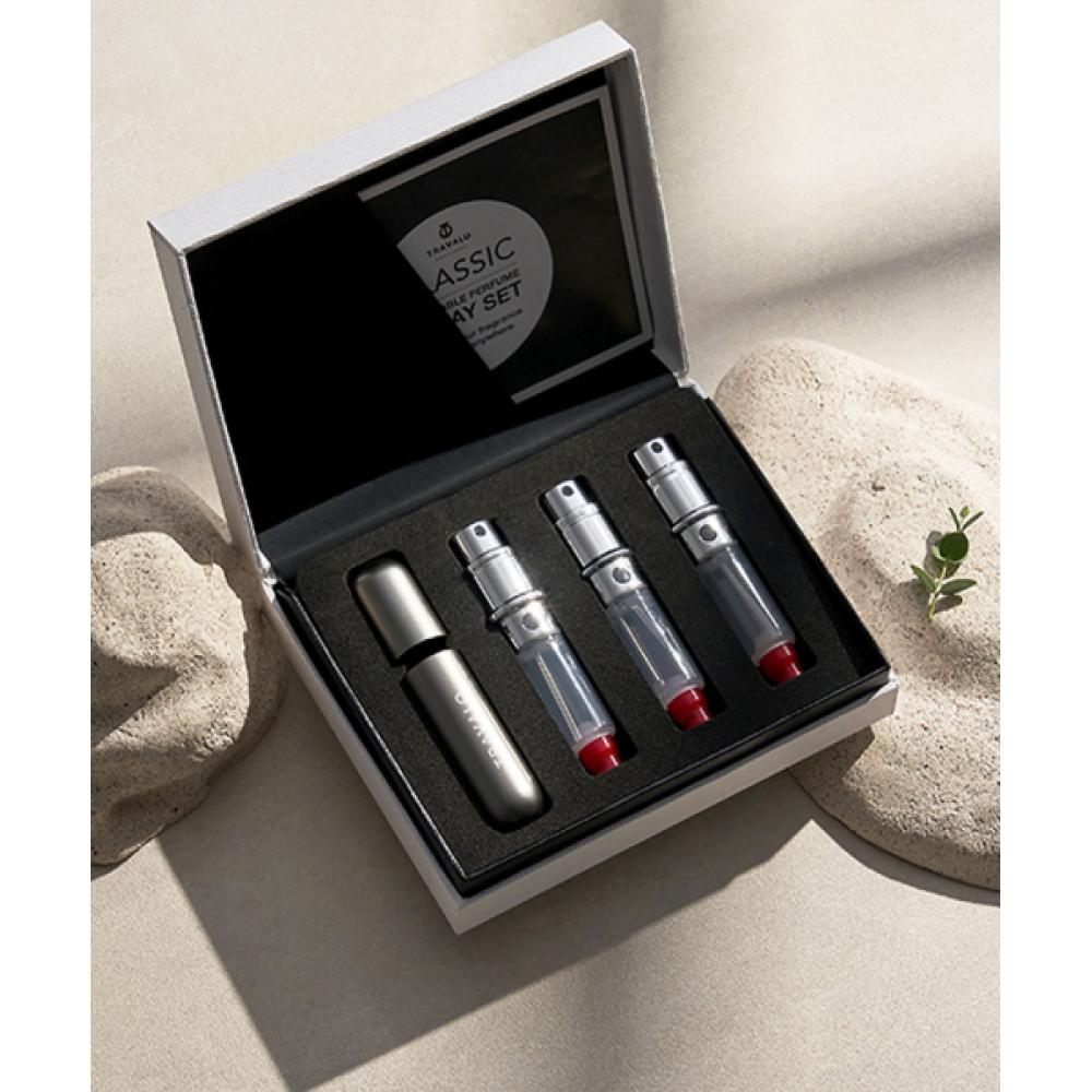 TRAVALO Classic New Engine Set Pump-Style Refillable Portable Perfume Bottle comes with one outer case and three G3 New Engines. This product is designed to conveniently refill perfumes, eliminating the need to carry a large and heavy original bottle, allowing you to spritz your fragrance anytime, anywhere. The packaging is luxurious, showcasing an exquisite design. The pump mechanism easily injects perfume into the bottle while automatically sealing it to prevent contact with air.