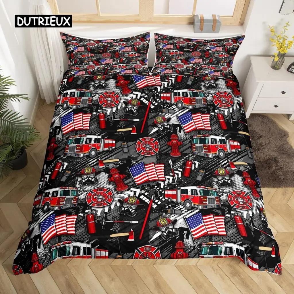 American Flag and Fire Truck Duvet Cover Set Twin Comforter Cover with Pillowcase Bedclothes USA F