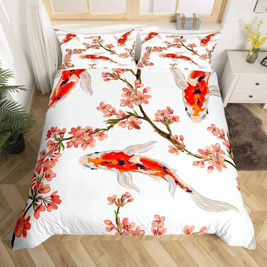 Koi Fish Duvet Cover Set Carp Tie Dye Bedding Sets Traditional Chinese Ink Art Bedspread Lotus Leaf Nature Quilt Cover Full Size