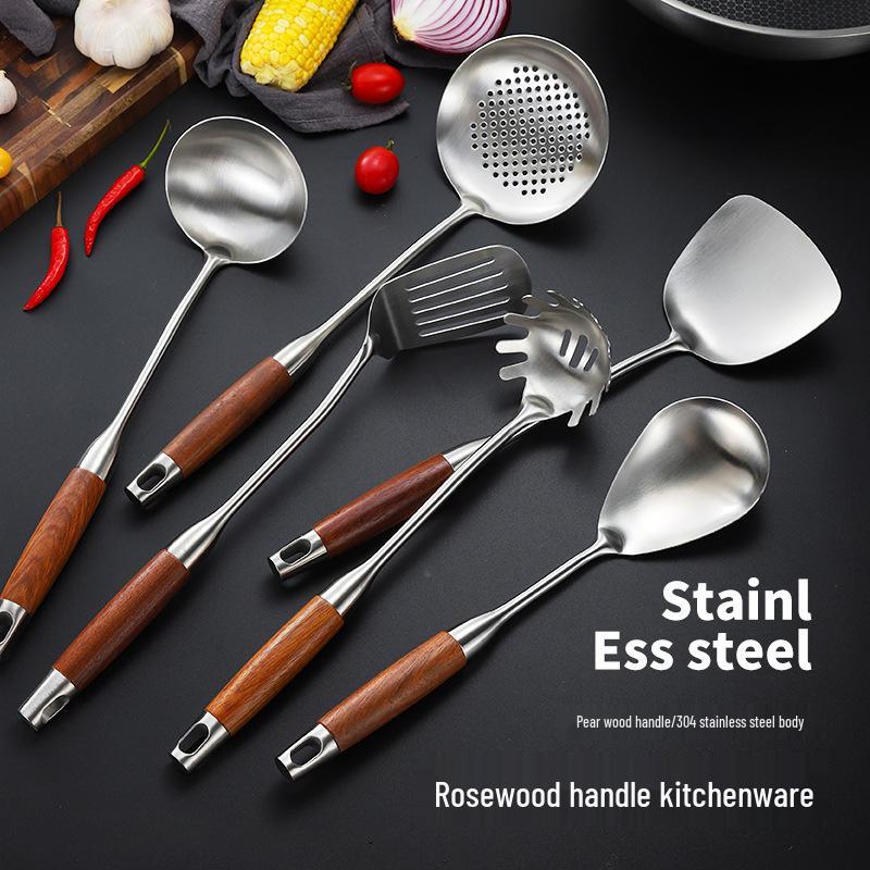 Solid Rosewood & 304 Stainless Steel Kitchen Utensil Set: Soup Ladle, Skimmer, Slotted Spoon, Frying Spatula, Strainer.