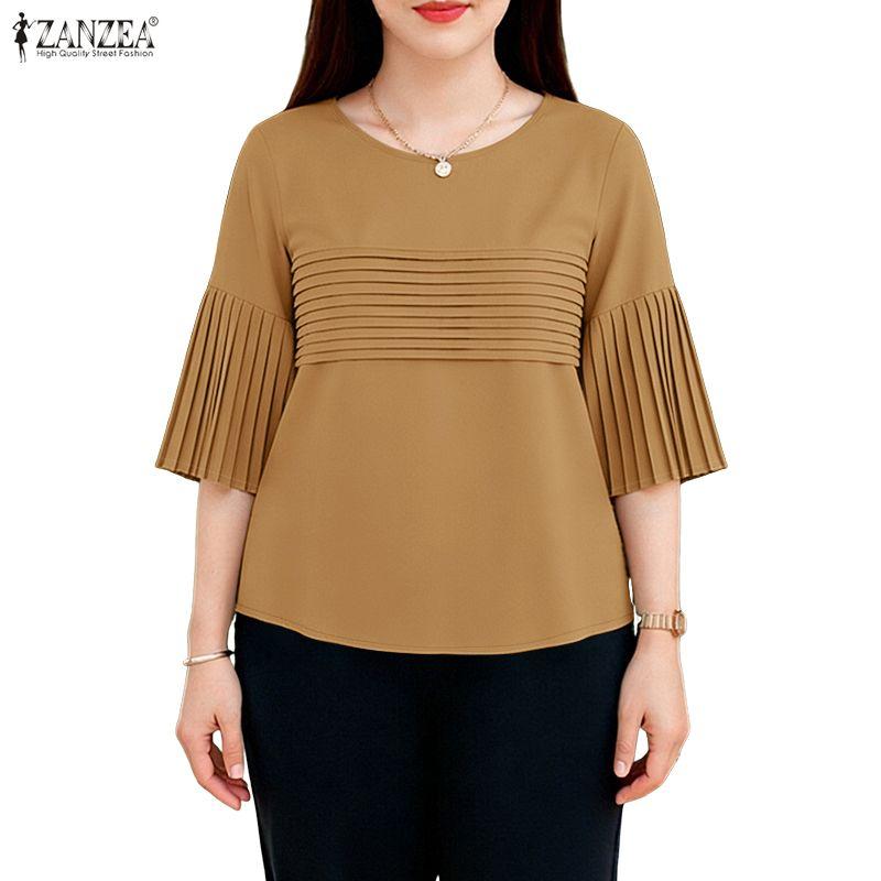 ZANZEA Women Casual Round Neck Solid Color 3/4 Sleeve Blouse