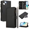 For iPhone 15 Plus Leather Case 9 Card Slots Zipper Wallet Stand Phone Cover with Wrist Strap