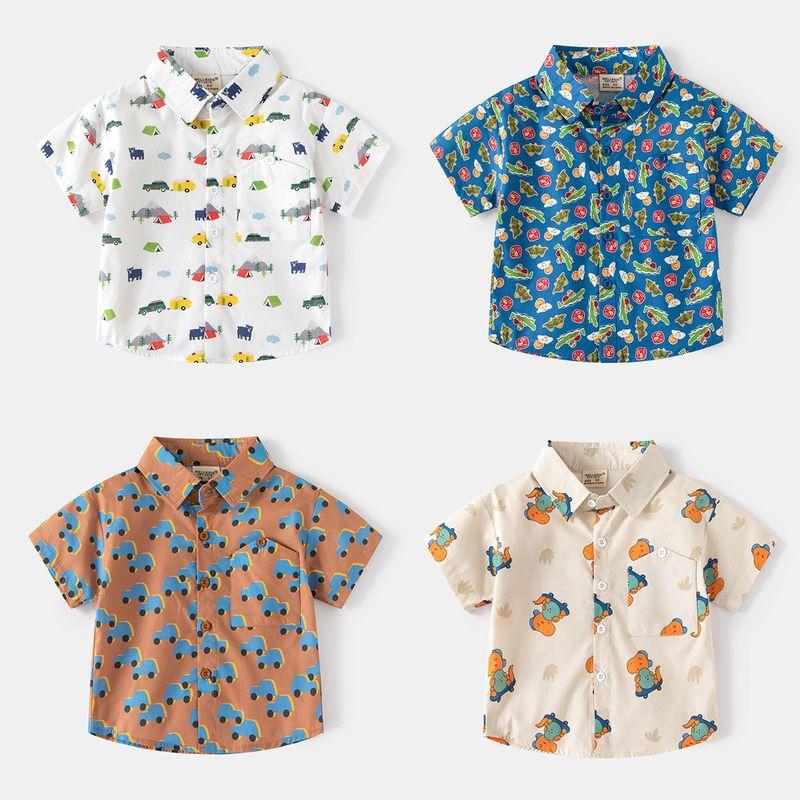 Boys' Car Printed Shirt Pure Cotton Summer Baby Boy Short Sleeve Shirt Children Dinosaur Half Sleeve Tops Seaside Vacation