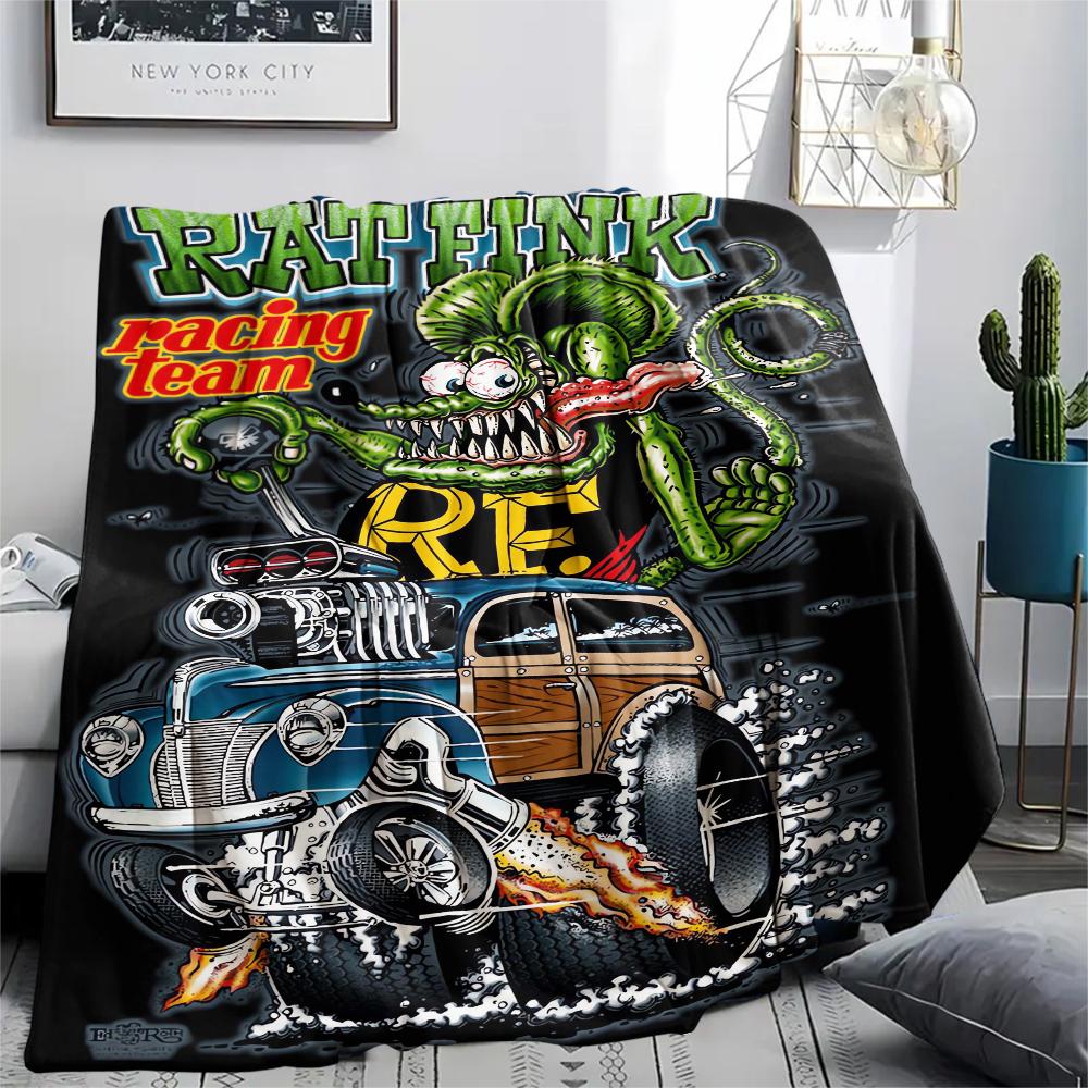 1Pc Rat Fink Print Flannel Blanket, High Quality Comfortable for All Seasons, Home Decor, Warmth and Comfort, Perfect for Christmas Gifts