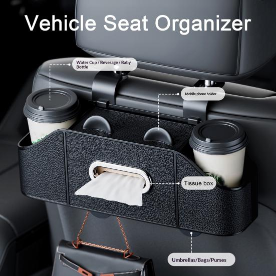 Car seat back storage box with 2 cup holders offers a durable and practical solution to keep your car interior organized. Made from high-quality plastic with fine workmanship, this multifunctional organizer features a partition design that securely holds paper towels, water cups, keys, cell phones, and more.