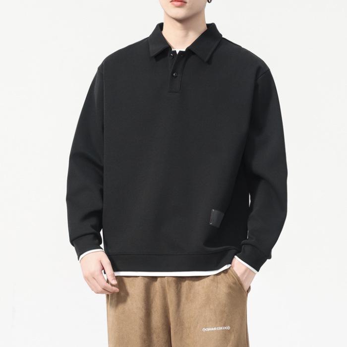 Elevate your style this spring and autumn with this trendy black fake two-piece hoodie polo shirt. Designed with long sleeves and a thin, breathable material, it provides comfort without compromising on style. The loose fit ensures a relaxed look, perfect for layering on cooler days. With its unique lapel design, this shirt brings a modern twist to your casual wardrobe.