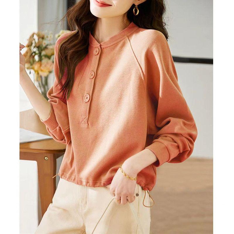 Simplicity Casual Autumn Pullovers T-shirt Women's O-Neck Solid Button Fashion Office Lady Loose Long Sleeve Sweatshirts Tops