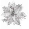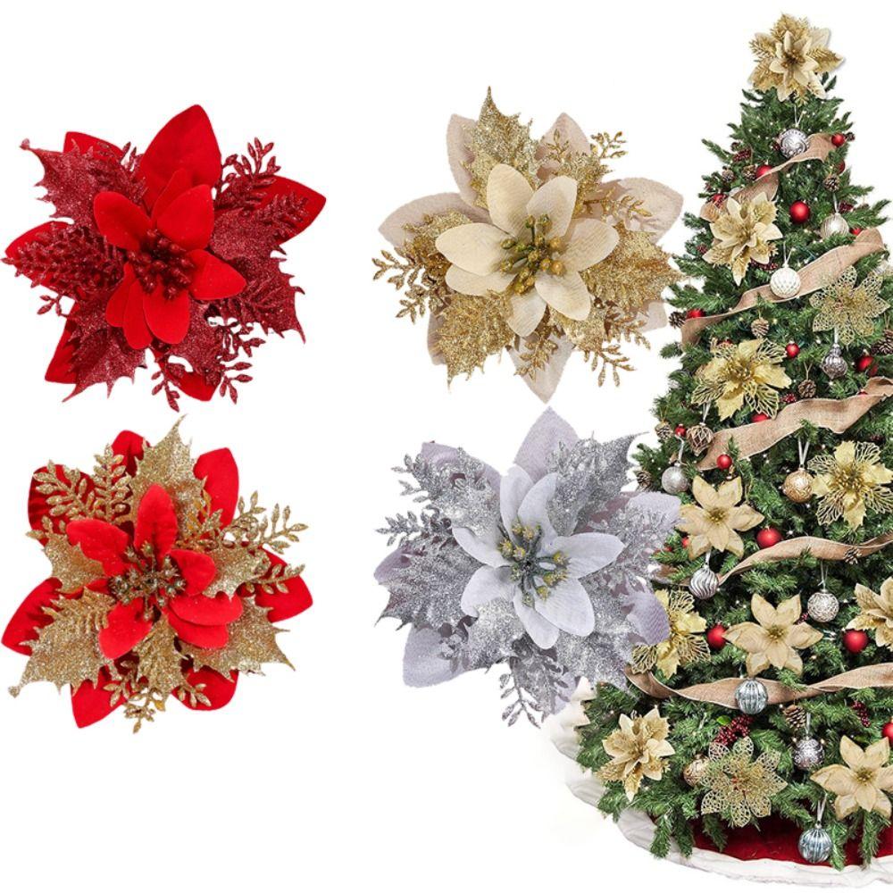 10Pcs 14cm Artificial Christmas Flowers Plastic Glitter Finish Christmas Glitter Flower Ornaments Sparkling Pink Red Gold