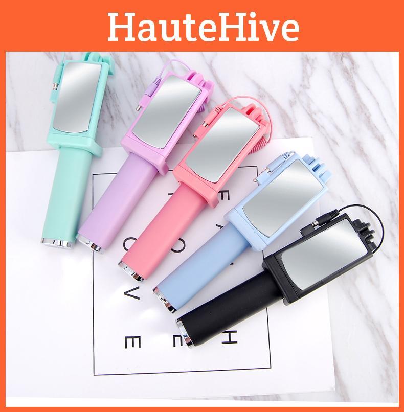 Pink Selfie Stick With Rotating Mirror And Rechargeable Light For Content Creators