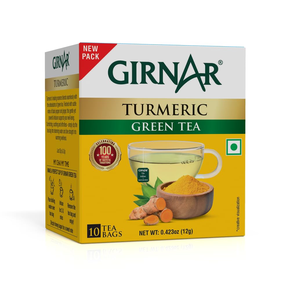 Girnar Green Tea with Turmeric Tea Bags 10 Count | Low Caffeine, Vegetarian, Allergen-Free Herbal Beverage