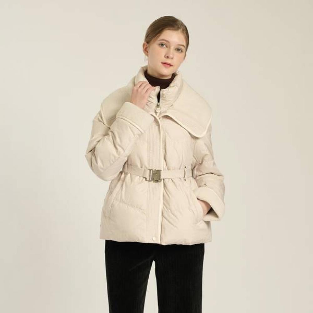 The Wide Collar Belted Duck Down B5W9Y972 is a women's jumper from BCBG, featuring a sophisticated wide collar design and a belt detail that accentuates the waistline. Made with duck down filling, it offers warmth and insulation, with a generous silhouette and length that naturally covers body shapes. The quilted pattern adds stylishness, and it includes a reversible function for two wearing options.