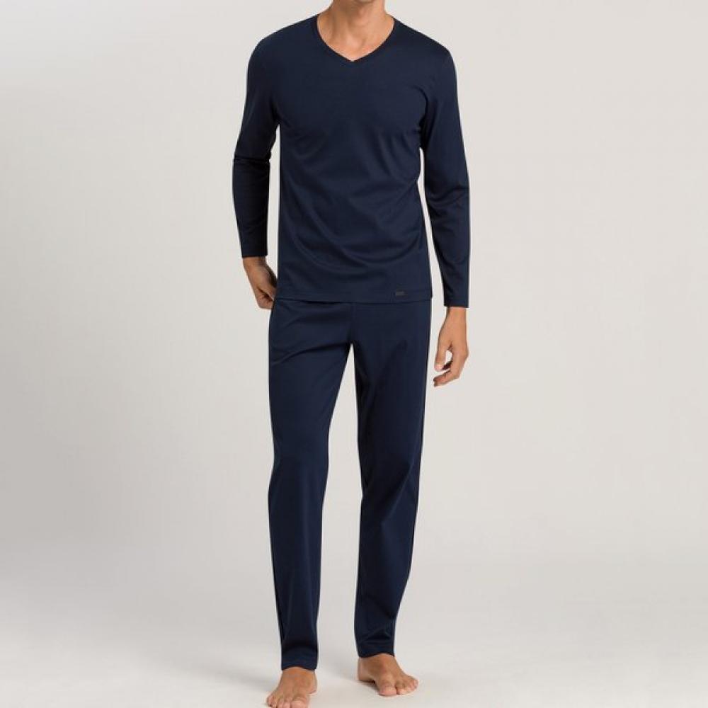 The HANRO Long Sleeve Pajama Set (75109_deep navy) consists of a long-sleeved top and bottom for men, crafted from a blend of merino wool and silk, providing a soft, lightweight feel while maintaining warmth. Each material offers natural insulation and breathability, and the silk adds a gentle touch against the skin for comfort. This product is suited as winter underwear or pajamas, being less irritating to the skin and hygienic due to its antibacterial properties.