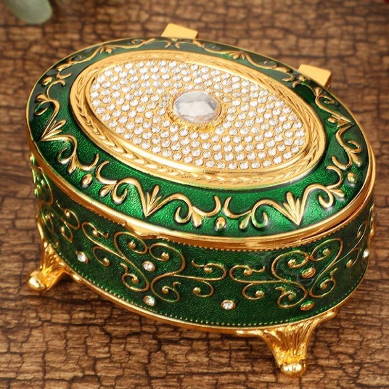 European Style Mini Jewelry Storage Box Organizer Portable Ellipsoid Inlaid Gem Alloy Necklace Ring Storage Dresser Display Case