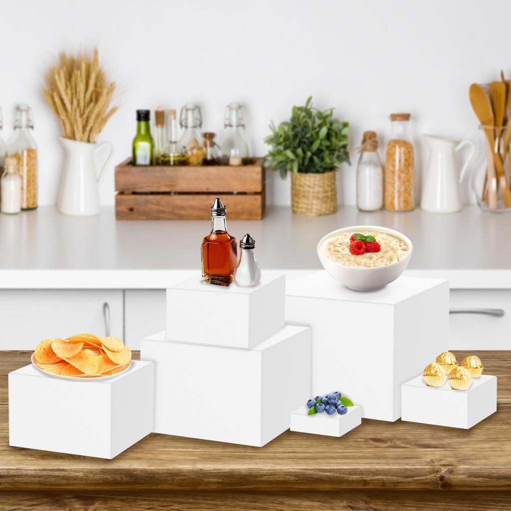 About the Package: The package includes six different sizes of acrylic boxes that can be used for dynamic and tiered displays. These food display stands will enhance your items and strengthen your presentation