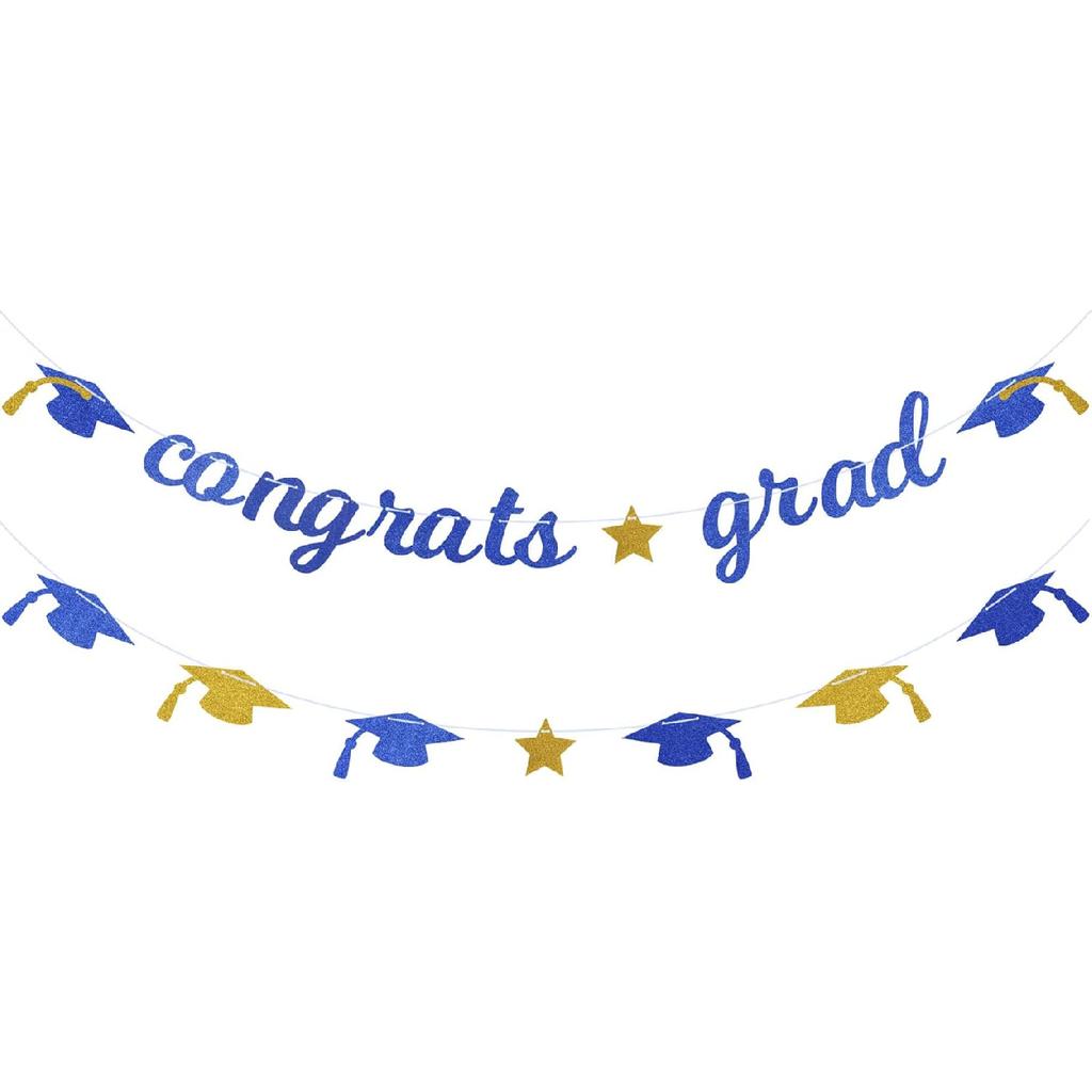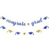 Package Include:one "congrats grad" with graduation hat banner garland, one blue and gold graduation hat banner garland.One banner string is 8.2 feet/2.5meters, one banner string is 6.5 feet/2meters, total is 14.8feet/4.5meters.